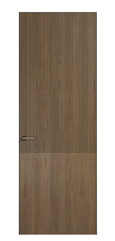 Это полотна с рельефной фрезеровкой. Этот прием делает интерьер объемным, тактильным, вносит интересную текстуру и создает современный образ. Волнистый рельеф может быть выполнен по ламелям из массива дуба в древесных матовых отделках, либо исполнен по натуральному и экологически безопасному материалу — ХДФ, покрытому гладкой эмалью актуальных оттенков.